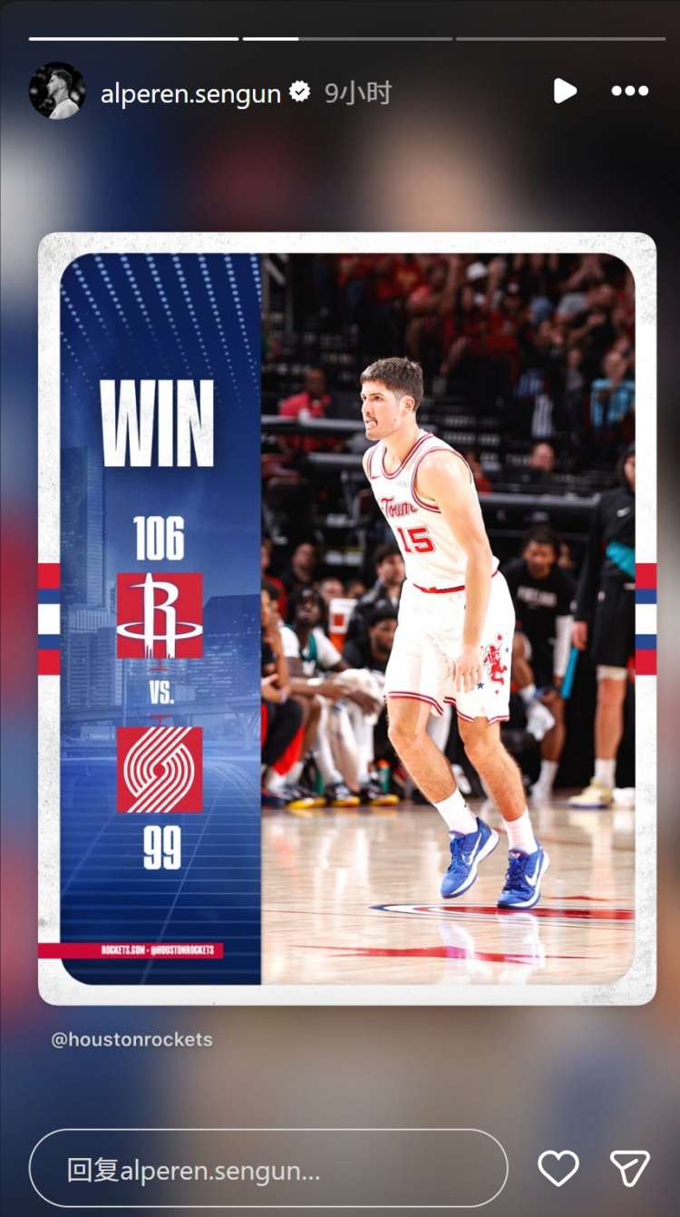 赛后申京在INS上转发了本场火箭官方晒出的赢球海报和自己的数据海报。