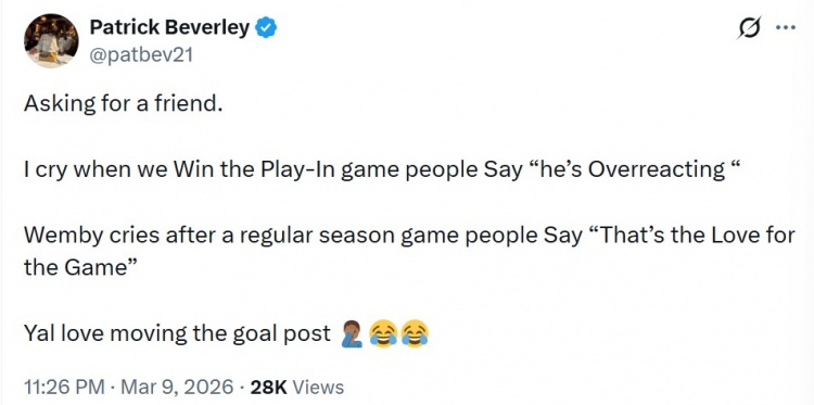 对此,贝弗利今天点评道:“为朋友问一下。当我们赢得附加赛时我哭了,人们说‘他反应过度了’。文班亚马在常规赛后哭了,人们却说‘那是对比赛的热爱’。你们真会双标啊??♂️??。”