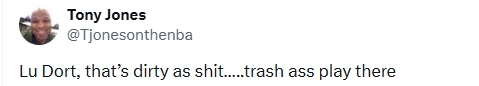 美记Tony Jones在个人社交媒体上写到:“多特这也太脏了吧……纯垃圾动作啊,太贱了。”