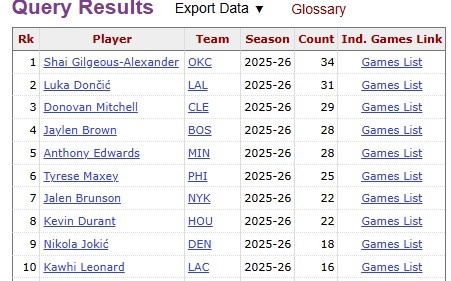 据统计,尽管缺席了最近9场比赛,亚历山大本赛季还是以35场30+领跑全联盟。榜单前十如下: