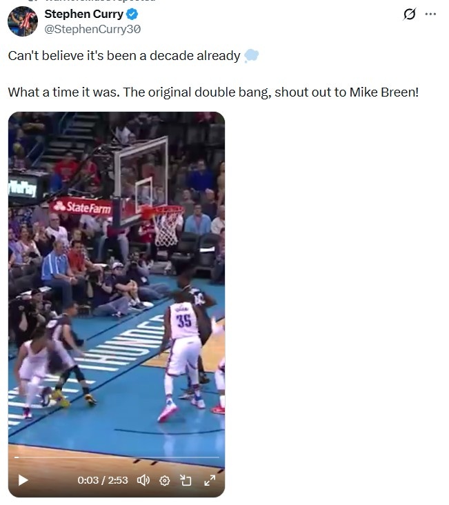 库里转发了当时的绝杀视频,并写道:“不敢相信已经十年了。那真是一段美好的时光,‘Bang Bang’的起源,向麦克·布林致敬!”