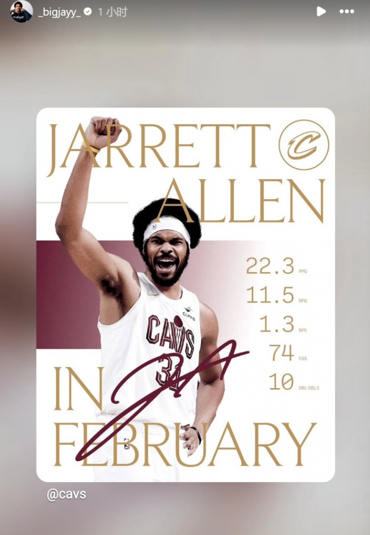 3月1日讯 今天,骑士中锋贾勒特·阿伦在INS上转发了自己二月份的数据,能得到22.3分11.5篮板1.3盖帽,投篮命中率74%,得到10次两双。