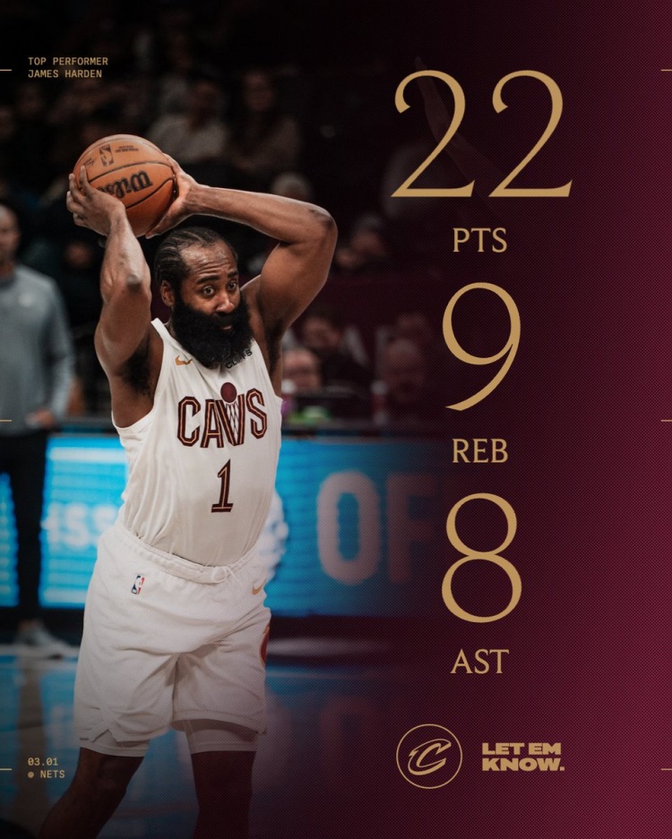 骑士官方晒出了本场哈登数据海报,写道:“大胡子复出并奉献了一场经典的表演。”