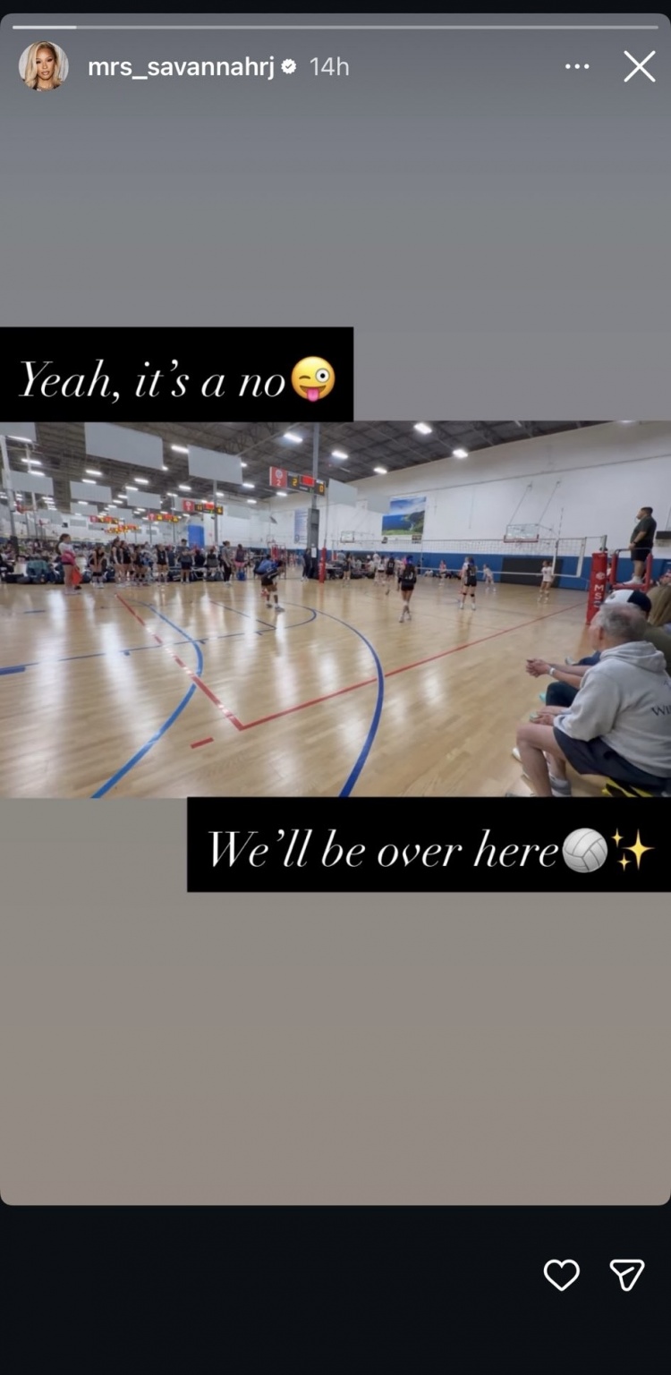萨瓦娜更新Instagram Story晒出她在场边观看Zhuri的排球比赛的视频片段,并回应道:“是的,回答是不行。?我们会来这边打排球?”