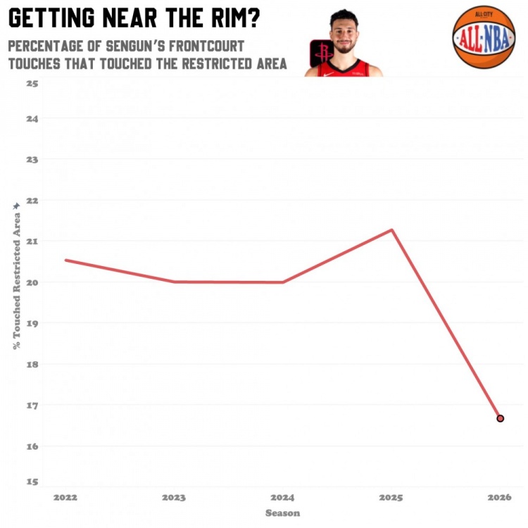 申京各个赛季在前场拿球时禁区触球占比,本赛季仅16.6%,创生涯新低