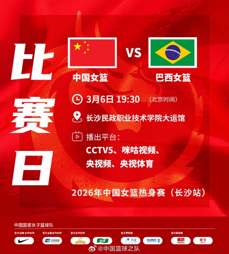 3月6日讯 中国篮球之队发布中国女篮最新赛事信息。今晚19:30,中国女篮将在长沙继续对阵巴西女篮。