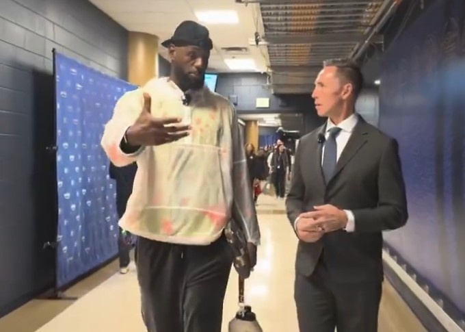 3月6日讯 今日NBA焦点战,湖人客场挑战掘金,詹姆斯赛前到场后见到了自己的播客搭档纳什。