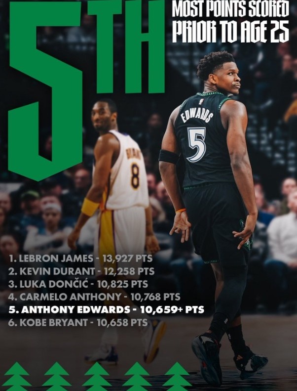 爱德华兹在25岁前总得分超越科比,上升至NBA历史第五,仅次于詹姆斯、杜兰特、东契奇和卡梅隆·安东尼。