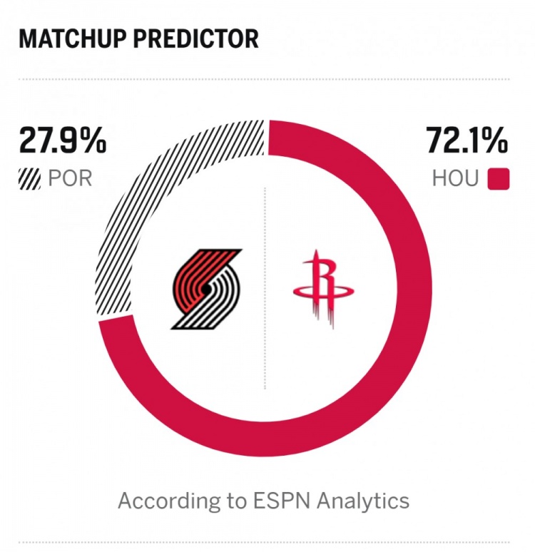 ESPN对本场胜率进行了预测,火箭胜率为72.1%,开拓者则是27.9%。