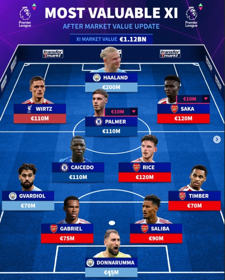 英超身价最贵阵:哈兰德2亿欧领衔 枪手5人曼城3人蓝军2人红军1人