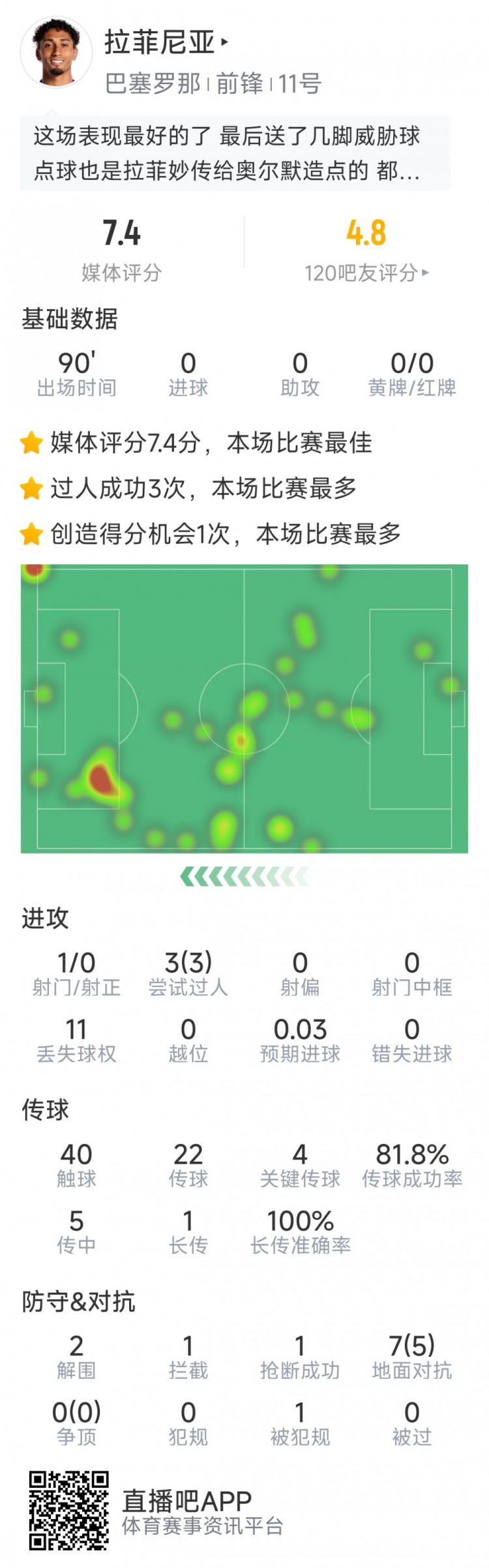 3月11日讯 在本轮欧冠淘汰赛,巴萨1-1战平纽卡,以下为拉菲尼亚本场数据: