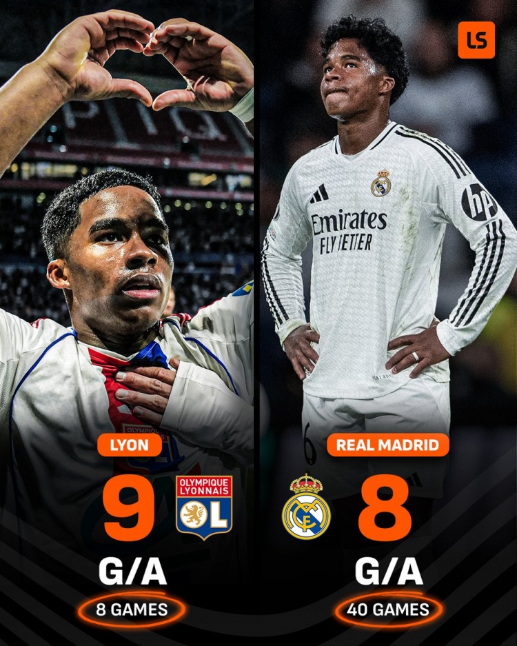 据媒体统计,恩德里克加盟里昂以来出战8场比赛,参与9粒进球,而此前他在皇马出战40场比赛参与8球。