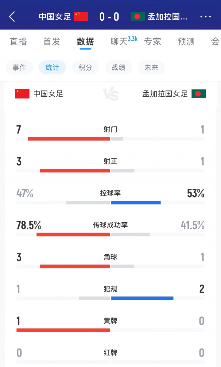 03月03日讯 2026女足亚洲杯小组赛,中国女足vs孟加拉国女足。开场还未20分钟,中国女足控球率47%,孟加拉国53%。