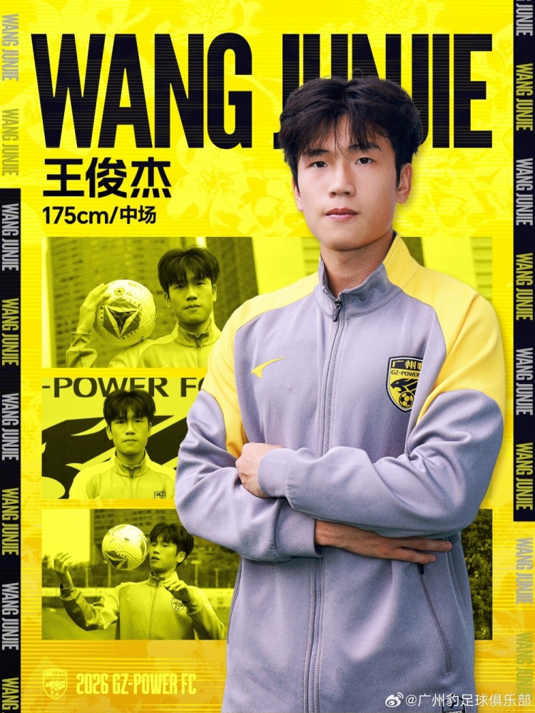 官方:浙江队球员王俊杰租借加盟广东广州豹,生于2005年司职中场