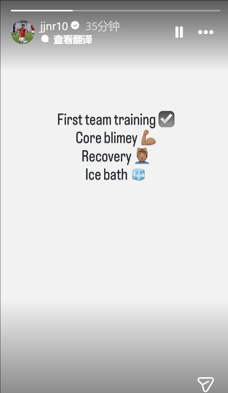 这位15岁小将写道:“一线队训练 ☑️核心力量训练 ??恢复性练习 ??♂️冰浴 ?。”