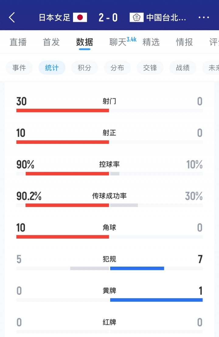 日本女足全场30次射门、10次射正,控球率90%;中国台北女足全场0射门,门将王郁婷屡献神扑。