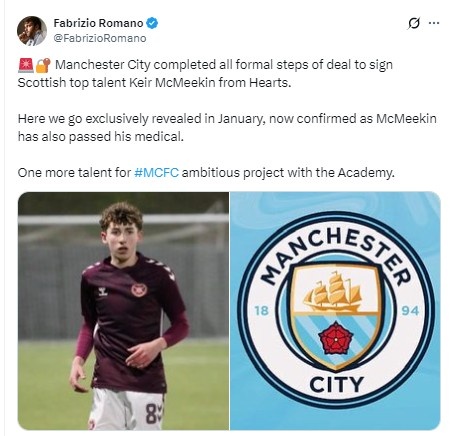 罗马诺写道:“曼城正式签下苏格兰天才球员基尔·麦克米金,后者已通过体检,这位来自哈茨俱乐部的年轻才俊将加入曼城的青训项目。1月份的时候我曾报道过这个转会消息。”