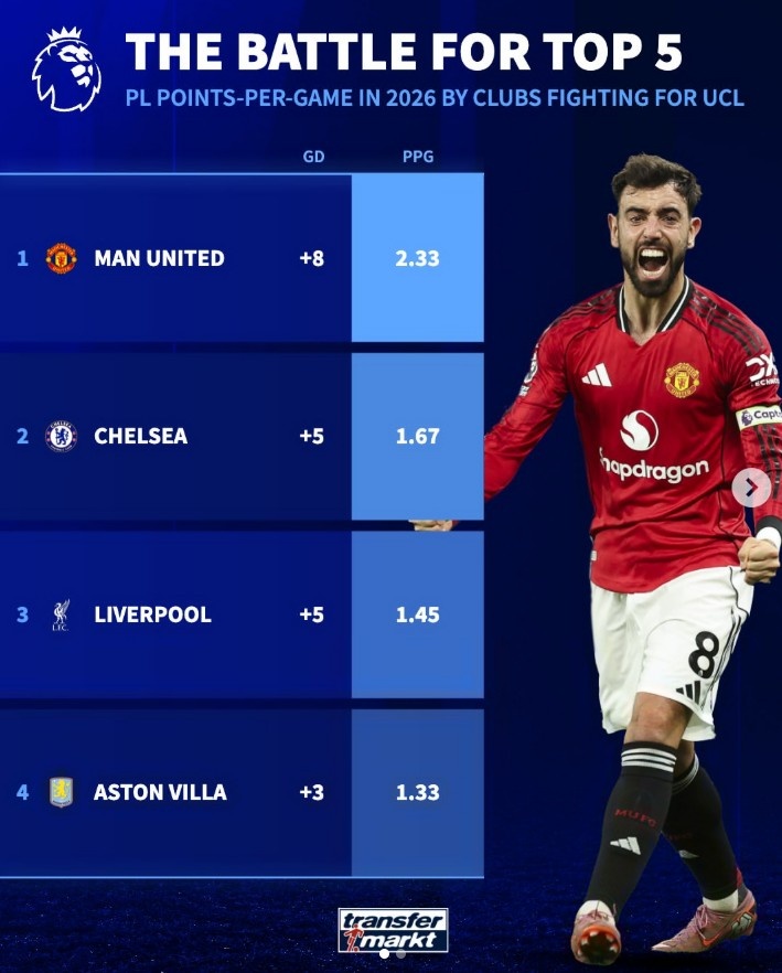 3月4日讯 本赛季英超欧冠资格争夺战日趋白热化,德转也盘点了目前在积分榜上3-6名球队在2026年场均积分以及总净胜球情况,具体如下:
